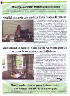 Hoje eu recebi na minha casa o Jornal da minha cidade Guarani /MG .Fiquei contente, pois eu defendo sempre esta postura democrática do gestor público ,detentor de cargo de prefeito.Cujo pagamento que recebe é fruto de impostos pagos pela população, por este motivo tem o dever e a obrigação de fazer a prestação de contas de tudo que está sendo realizado na prefeitura.